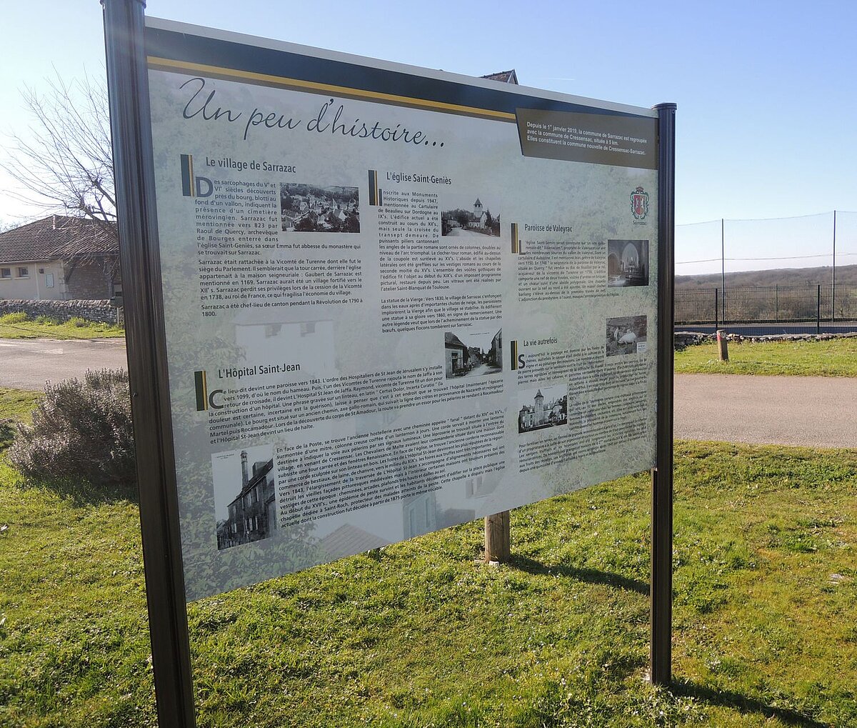 Deux grands panneaux d'informations ont été installés dans les deux bourgs dont un sur la place Taillardat à Sarrazac contre le mur du presbytère. Ce panneau présente une carte de la commune historique avec nos trois circuits pédestres et des photos de quelques lieux remarquables. Sur la place du moulin d'Antoine à l'Hôpital Saint-Jean, on trouve, sur une face, le même panneau qu'à Sarrazac et sur l'autre face, l'historique de la vie autrefois.